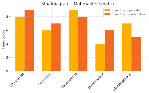 Een staafdiagram werkt goed als je wilt vergelijken. Per onderwerp maak je twee staven: één voor de impact op het bedrijf en één voor de impact op de omgeving. Dit maakt het makkelijk om scores te vergelijken.